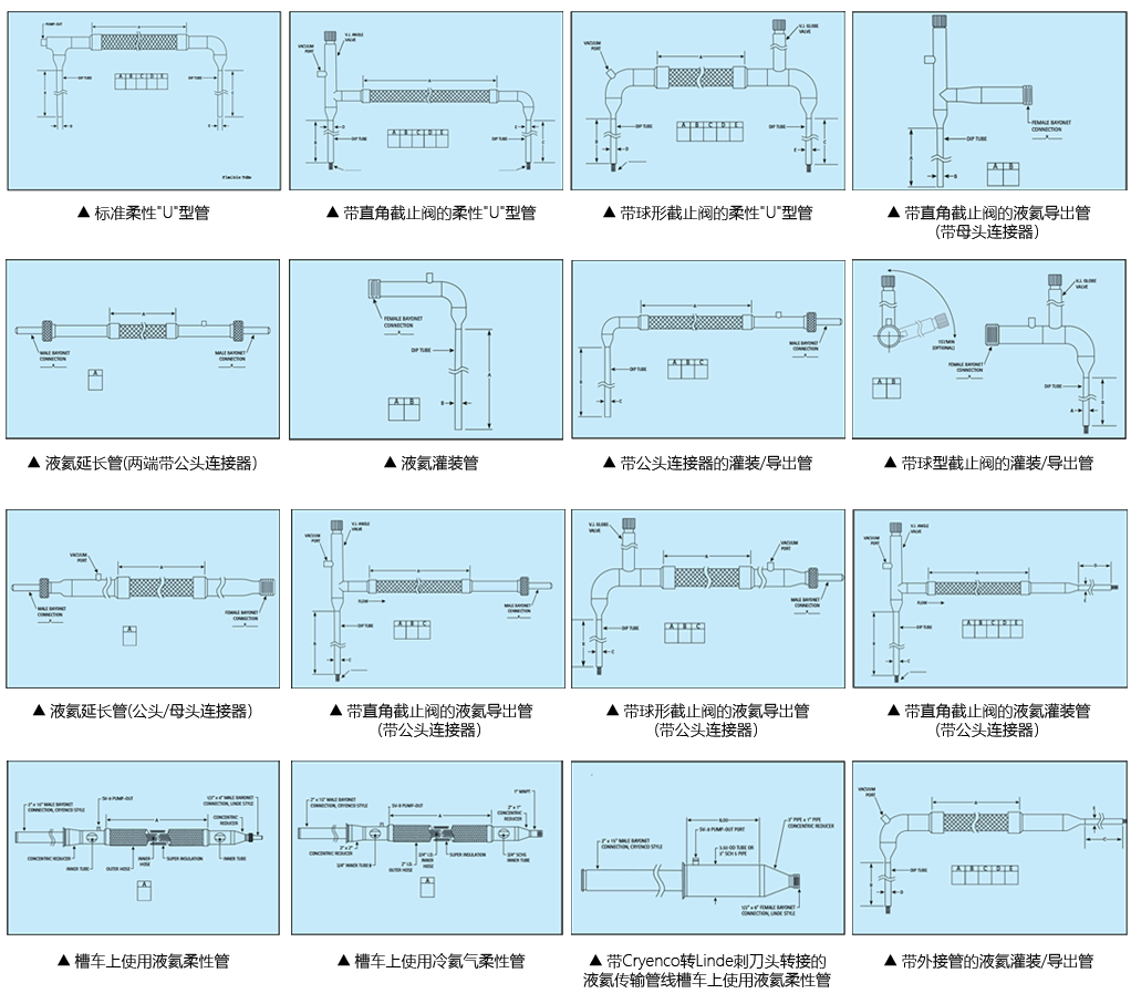 CFHT的柔性液氦传输管线有多种配置,请参见下面常见配置示意图