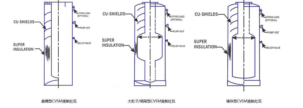 分为带液氮夹层的超导磁体杜瓦(CSM)和带蒸汽冷屏型超导磁体杜瓦(CVSM)两类,专为超导磁体研究设计,全不锈钢材质,有直桶型、大肚子/ 细尾型和储存型三种基本结构,可容纳各种类型的超导磁体线圈,其中直桶型是最常用的一种,液氦储槽从上到下是直的,超导磁体或实验装置插件从超导磁体杜瓦的顶部插到底部时不会遇到任何阻挡。大肚子 / 细尾型杜瓦的液氦储槽中部尺寸较大,上部和下部尺寸较小,允许磁体插入液氦储槽下部的细尾处,液氦主要位于磁体上方的大肚子部位,可有效提高液氦利用率,大肚子/ 细尾型杜瓦的脖颈、大肚子、尾部等尺寸可定制。储存型超导磁体杜瓦的脖颈内径比液氦储槽直径要小,可存储更多液氦同时减小液氦的蒸发率。